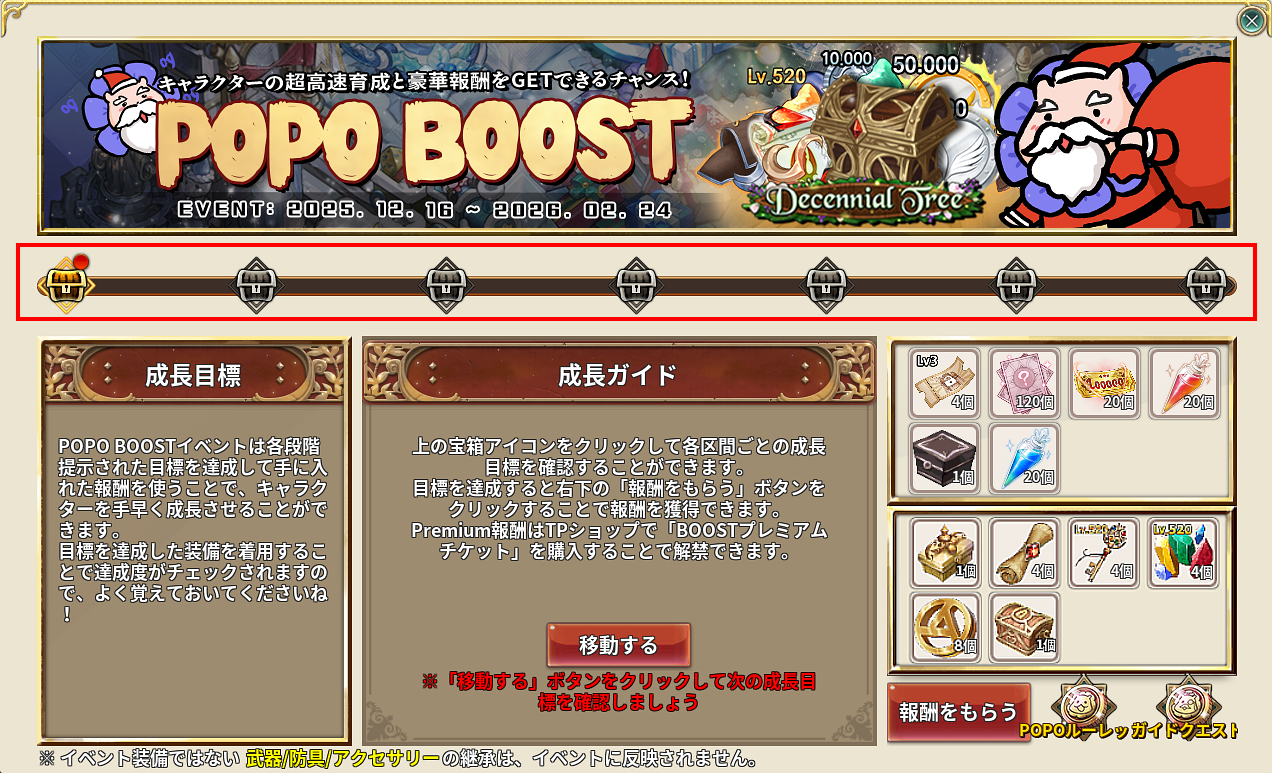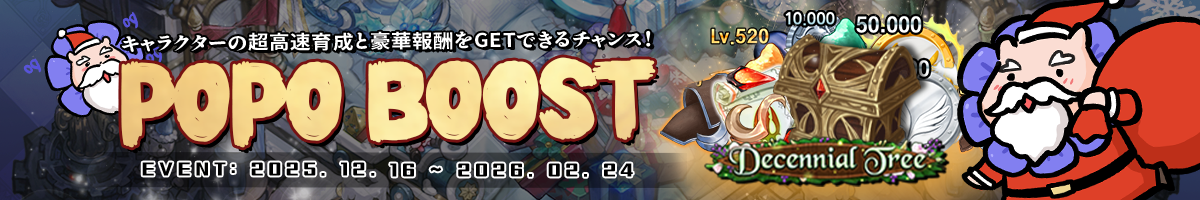 「POPO BOOST」イベントとは、各段階の成長目標を達成すると獲得できる報酬によって、キャラクターを手早く成長させることができるイベントです。