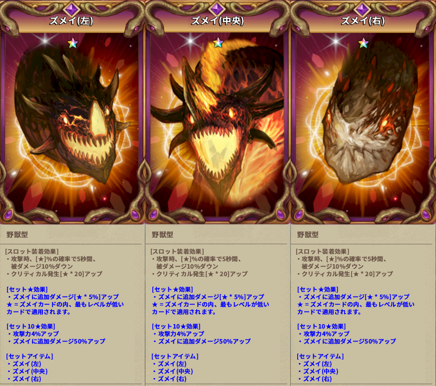 ズメイカードは通常の(パープル)カードスロットに装着できるカードであり、さらにカード3種をすべて装着するとセット効果が発動します。