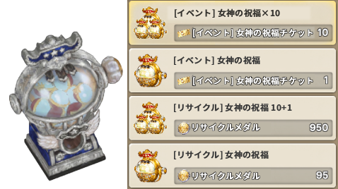 [イベント] 女神の祝福NPCを通じて、「[イベント] 女神の祝福チケット」や「リサイクルメダル」などを消費するガチャを利用できます。